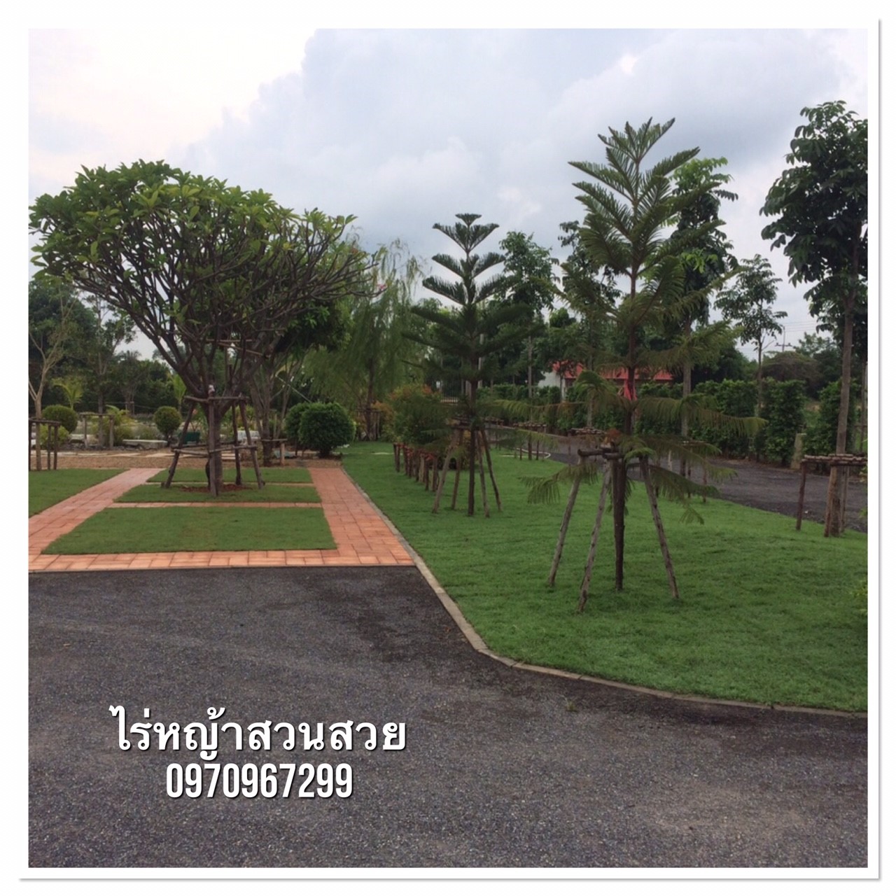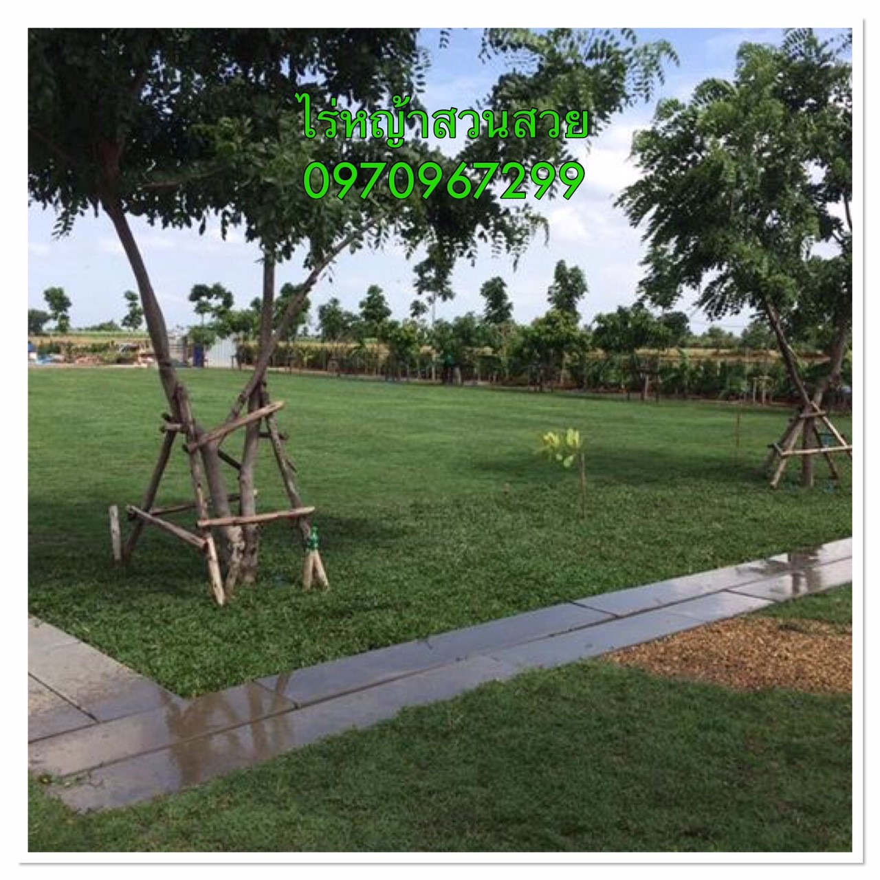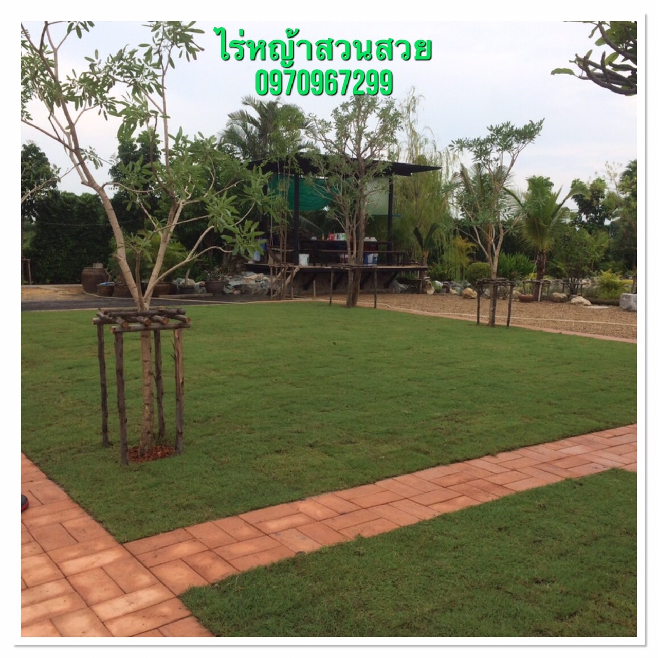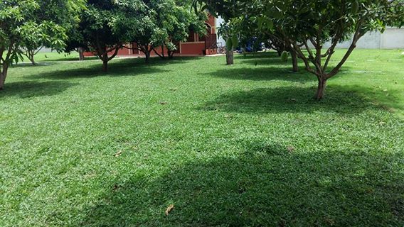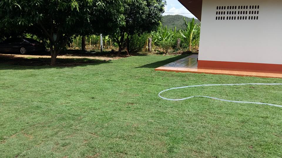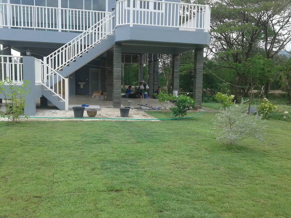 ผลงานการตกแต่งสวนให้กับบ้านลูกค้าที่จังหวัดกาญจนบุรี ด้วยการปูหญ้านวลน้อย 500 ตรม. กับผสมผสานกับหญ้าเบอร์มิวด้าอีก 110 ตรม. |
